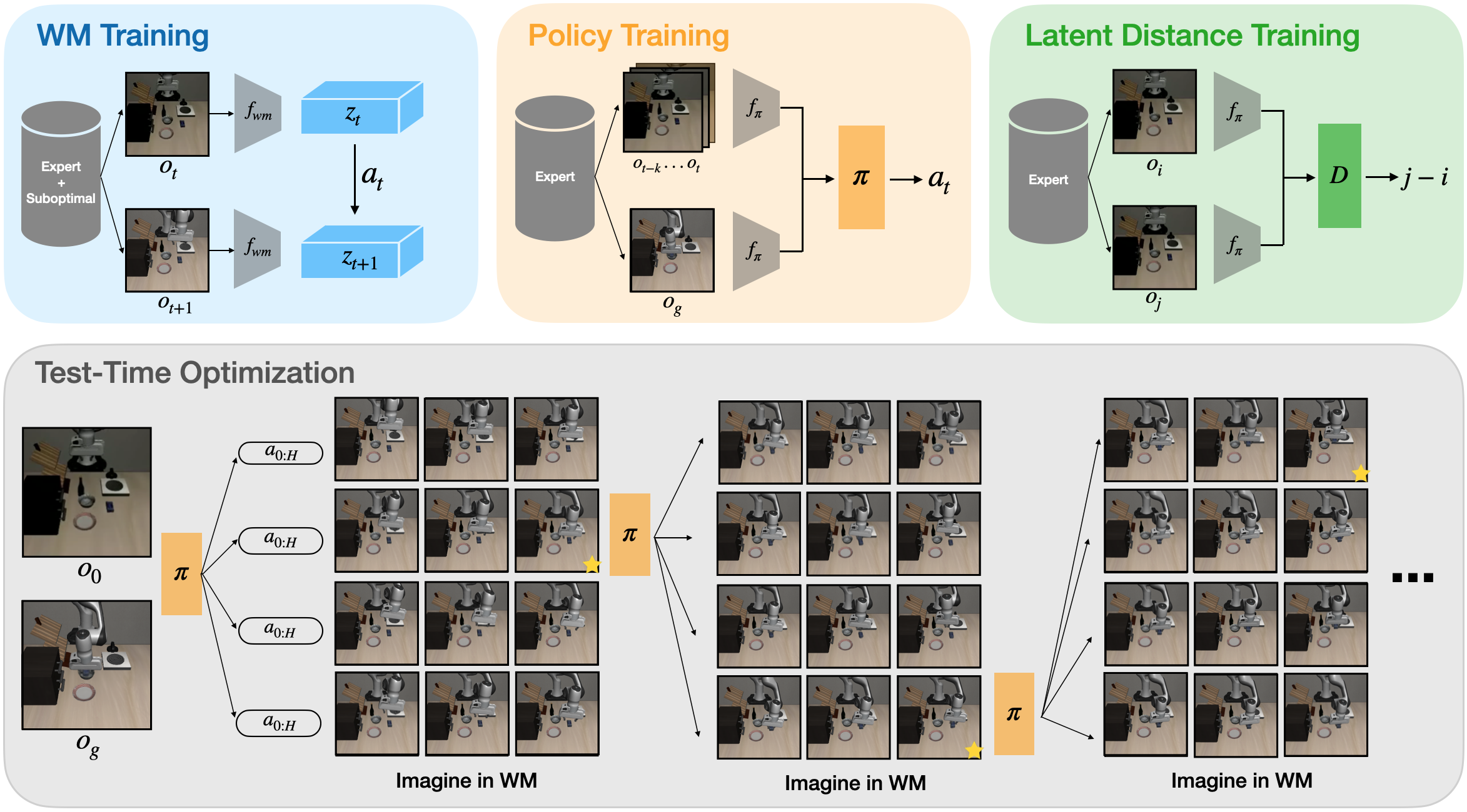 Our approach trains a diffusion policy as a generative prior over action sequences, and uses a shared latent world model to simulate and rank candidate trajectories. Crucially, instead of executing the policy output directly, we sample multiple candidate trajectories, imagine their outcomes in latent space, and select the most promising one for execution. This allows us to reuse generic knowledge from the training set at test time—without additional supervision or interaction.